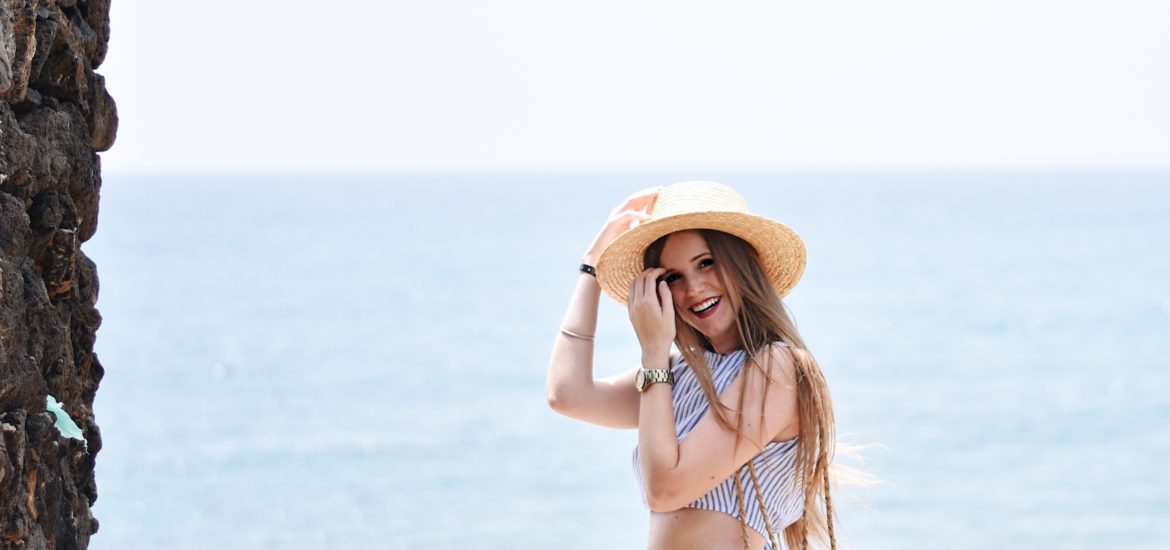 El que llevo yo en concreto es de SheIn (Ver Aquí), y os recomiendo muchísimo su web porque tienen miiiiles de conjuntos, además de que el precio está genial. No sabéis lo que me costó elegir… Al final me decanté por el que llevo de rayas blancas y azules. Me enamoró la espalda del crop top, aunque también podríais girároslo y que el lazo de atrás pasase a la parte delantera, y es que las blusitas con un lazo anudado en el pecho están siendo otro “must”. Combiné el conjunto con un sombrero de paja de copa rígida, mi inseparable cestita de pompones y, aunque no se vean en las fotos, unas alpargatas negras con suela de paja. Genial para un paseo por la playa, ¿verdad?